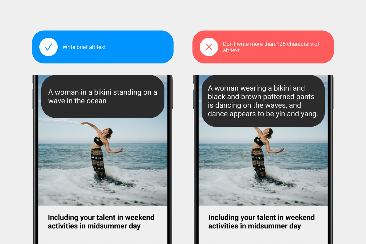 Describe the context and overall meaning, rather than focusing on the details. For example, in a shopping app, focus on the item for sale rather than the things around it.