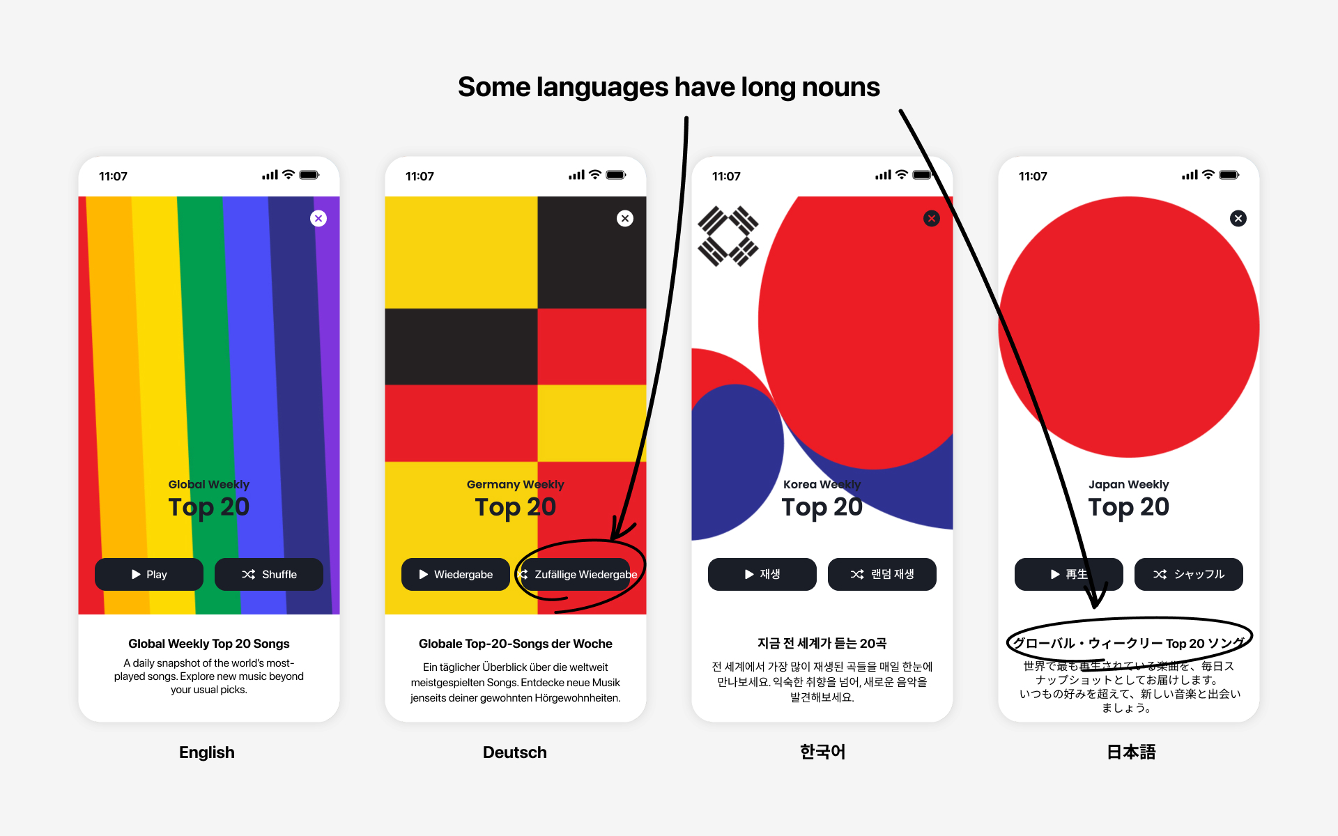 Creating exclusively left-to-right designs and experiences. Not all languages go from left to right. In fact, some of our key languages at Mùsica, like Arabic and Hebrew, are read from right to left. This can affect the overall layout of the design, because on-screen text needs to be able to look good starting from either side of the screen. Additionally, in countries like Korea, Japan, and China, text can also be written vertically, which introduces another layer of consideration for flexible and inclusive design.