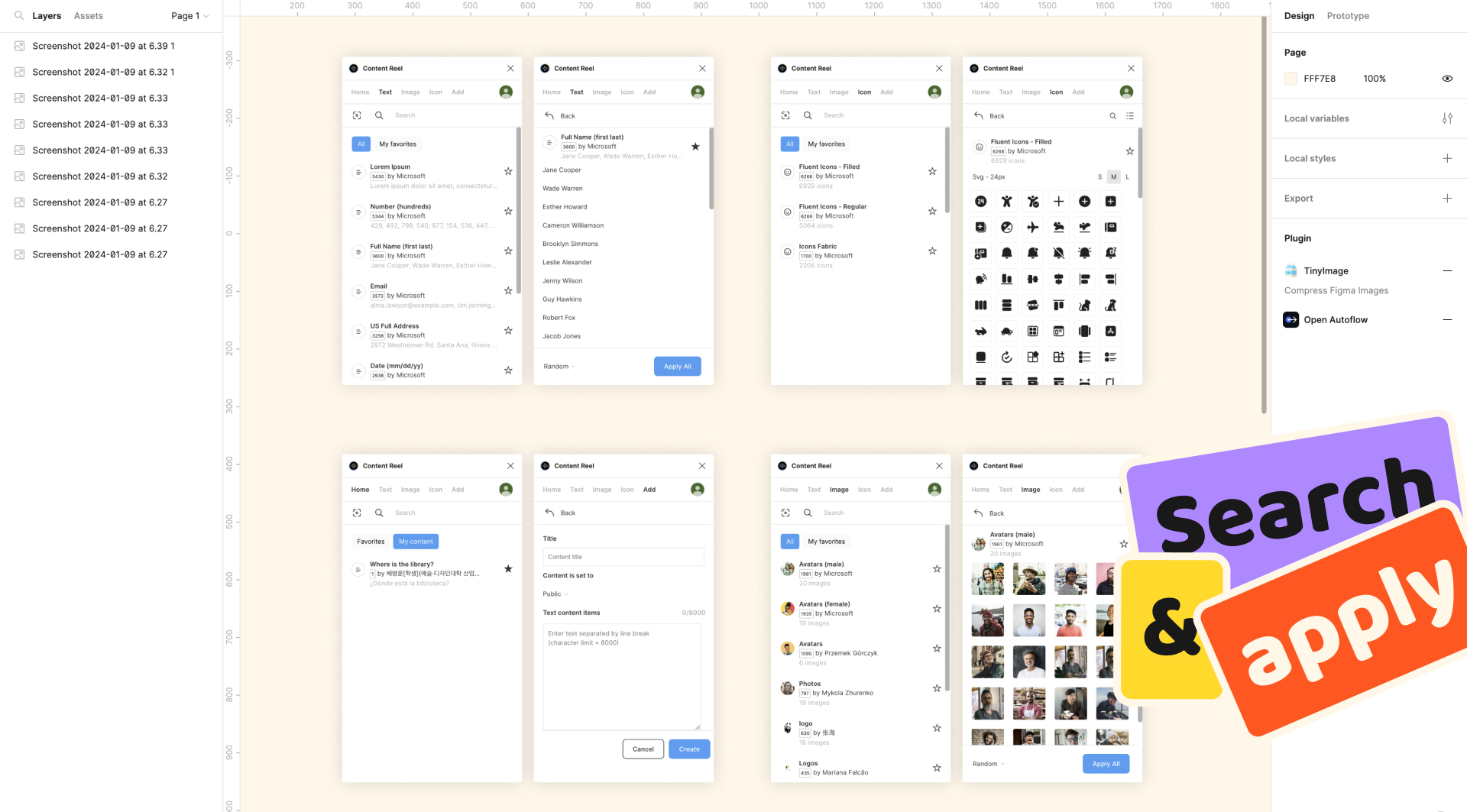 Design layouts more efficiently by pulling text strings, images, and icons from one palette. Content Reel lets you create custom content and share it with other Figma users. Collaboration has never been easier!