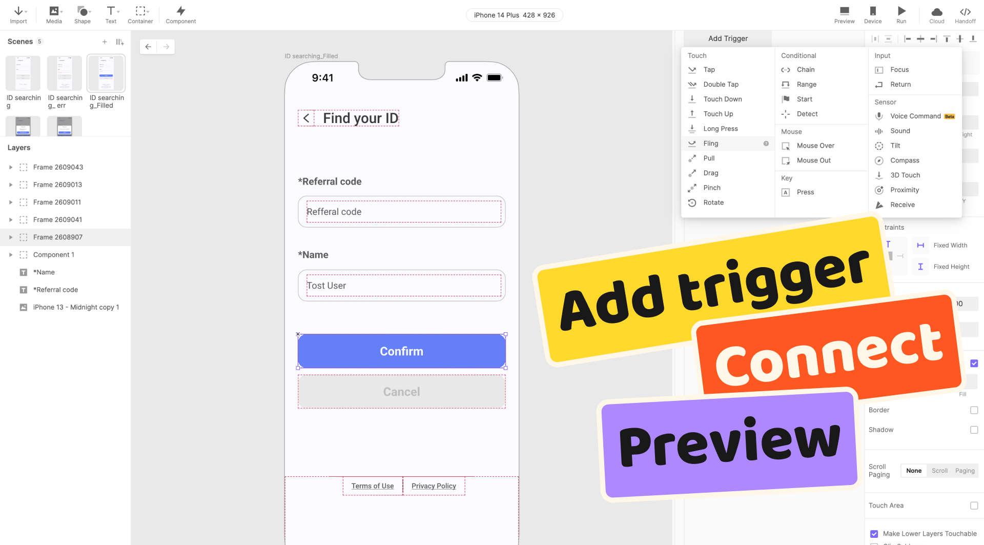 If Figma is your go-to UI design tool, ProtoPie can help you take your prototypes to the next level with dynamic interactions like conditions, formulas, and variables. You can add text input, camera, voice, and media playback, or even create prototypes that communicate with each other—it's all possible.