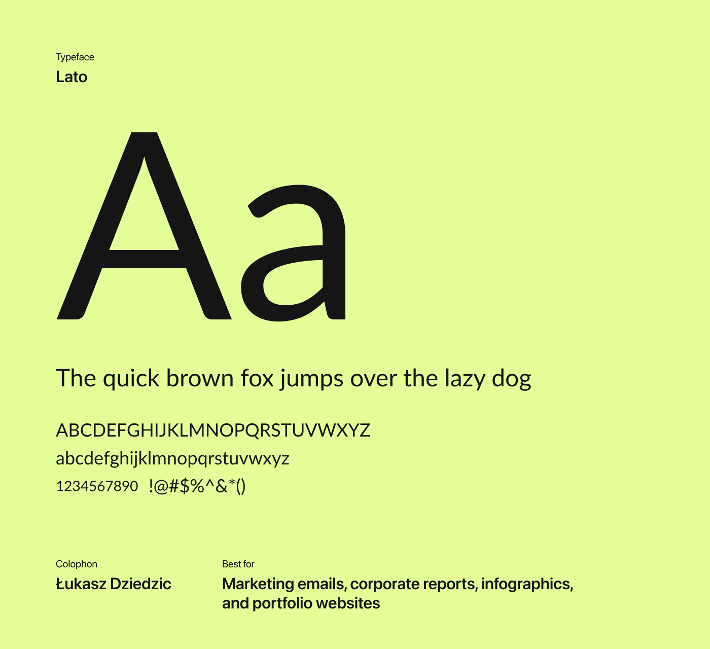 Lato is a sans-serif typeface designed in 2010 by Łukasz Dziedzic, originally commissioned for a corporate identity. Its name—meaning “summer” in Polish—hints at the font’s distinctive balance of professionalism and warmth. Combining strong structural foundations with subtle curves, Lato keeps text both highly readable and visually inviting.
