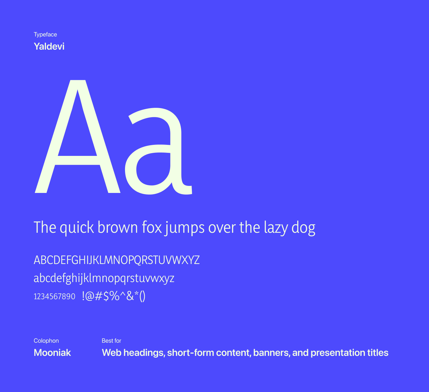 Yaldevi is a narrow neo-grotesque sans-serif typeface designed for headlines and shorter passages, where space efficiency and clarity matter most. Its compressed letterforms and short ascenders and descenders allow more text to fit comfortably on a line without feeling cramped, while gentle curves introduce a subtle, slightly playful personality.