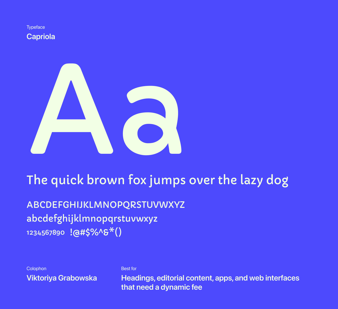 Originally created for digital screens, Capriola serves as a friendly, character-rich alternative to utilitarian fonts like Verdana or Tahoma. Well-proportioned letterforms and strong legibility make it versatile enough for both editorial layouts and web design, working equally well in headlines and longer passages where clarity and personality need to coexist.