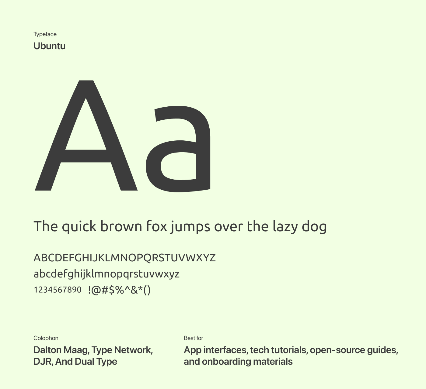 Supporting Latin, Greek, and Cyrillic scripts, Ubuntu offers a wide range of weights along with normal and italic styles, allowing designers to emphasize different sections of text without disrupting visual flow. With its calm, slightly stiff expressiveness and competent, business-oriented character, Ubuntu is a versatile choice for multilingual and professional design projects alike.