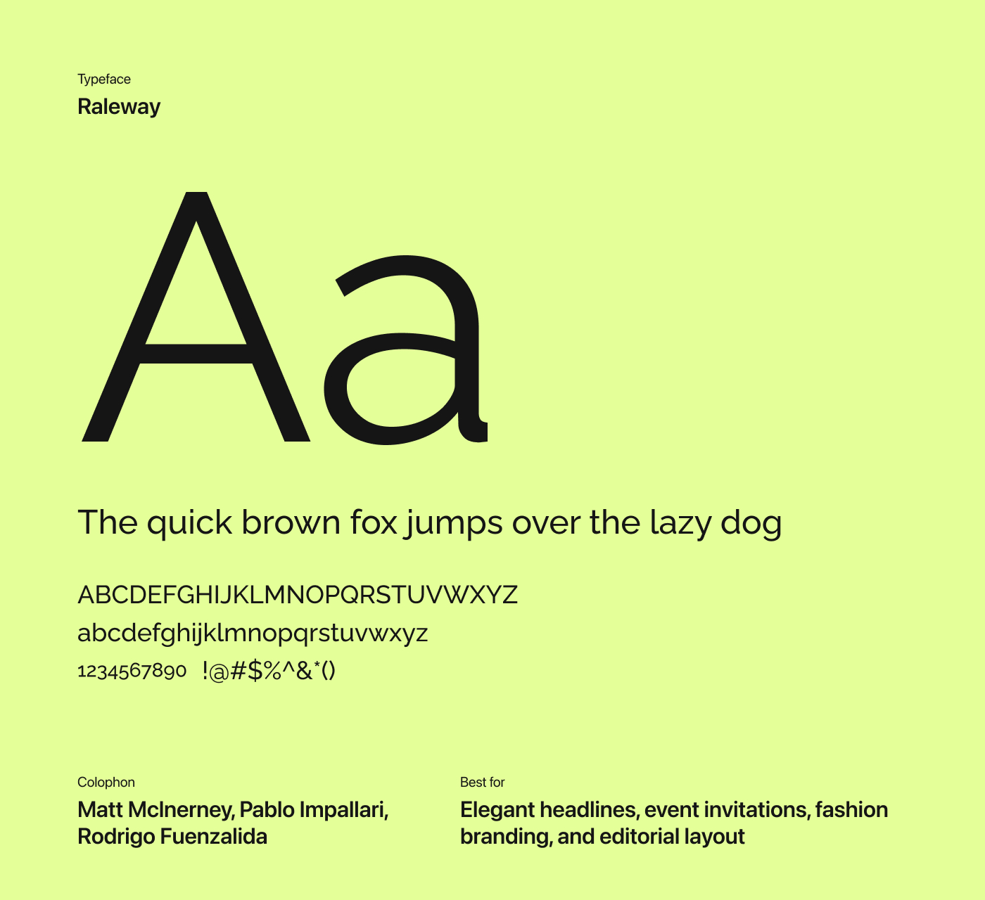 Designed by Matt McInerney, Pablo Impallari, and Rodrigo Fuenzalida, Raleway originally debuted as a single thin weight and was later expanded into a nine-weight family in 2012. It supports multiple scripts, including Latin and Cyrillic, and is complemented by a sister family, Raleway Dots, adding further flexibility to its design system.