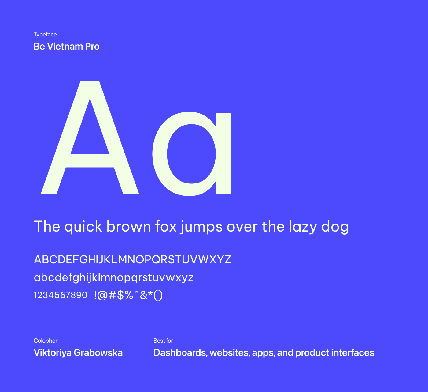 Be Vietnam Pro is a neo-grotesque sans-serif typeface designed with digital reading in mind, featuring generous spacing and open letterforms that make text easy to scan across screens. Building on the original Be Vietnam typeface, it supports Vietnamese and extended Latin scripts, making it a reliable choice for multilingual and tech-focused projects.