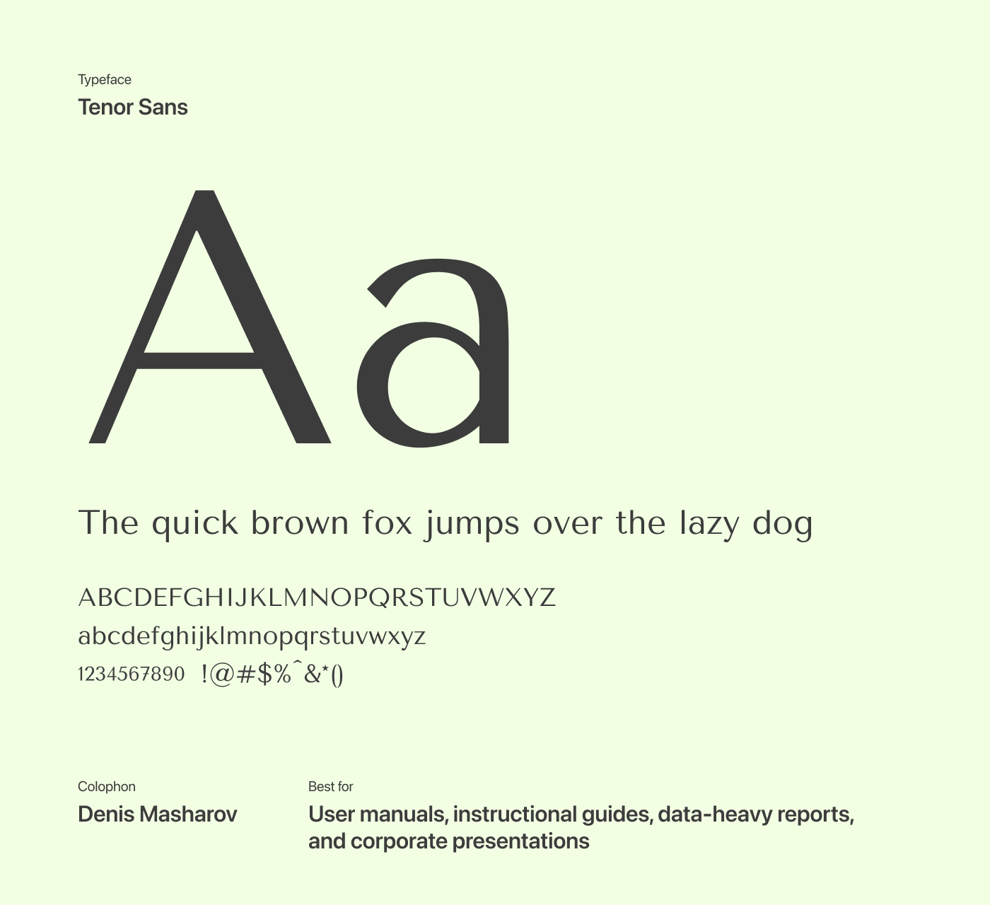 Tenor Sans is a humanist sans-serif typeface with elegant, extended letterforms that bring a sense of calm and balance to dense layouts. Its uniform stroke thickness and even spacing help maintain structure and clarity, making it comfortable to read in both content-heavy pages and more restrained editorial designs.