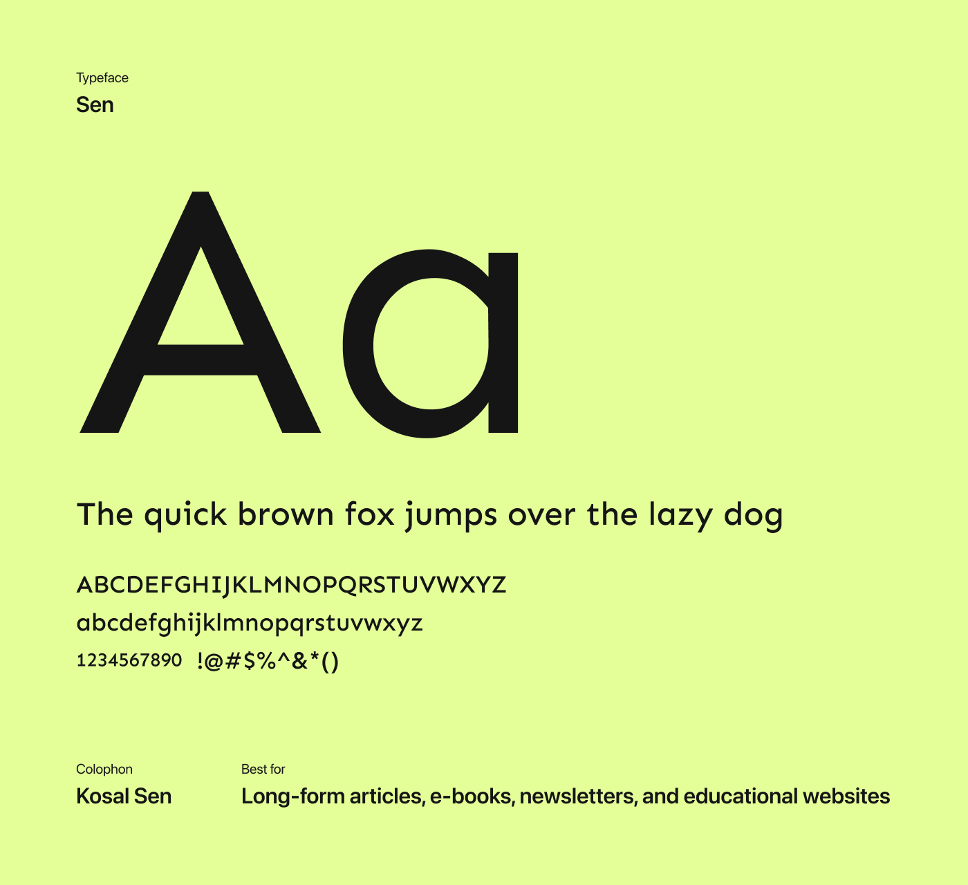 Sen is a geohumanist sans-serif typeface with compact letterforms and generous spacing that naturally guide the eye through long reads. Its consistent stroke weight creates a smooth reading rhythm, helping dense content feel organized, calm, and approachable—making it a strong choice for tutorials, documentation, and long-form explainers.
