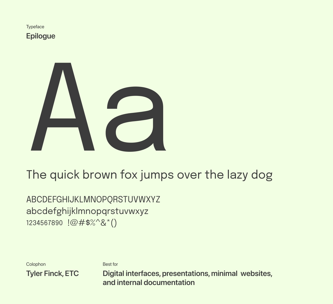 Epilogue is a clean, versatile geometric sans-serif typeface with open spacing and a steady, minimalist structure, making it well suited for clear, straightforward communication in digital projects. Its restrained design helps content take the lead, allowing typography to stay quietly in the background when needed.