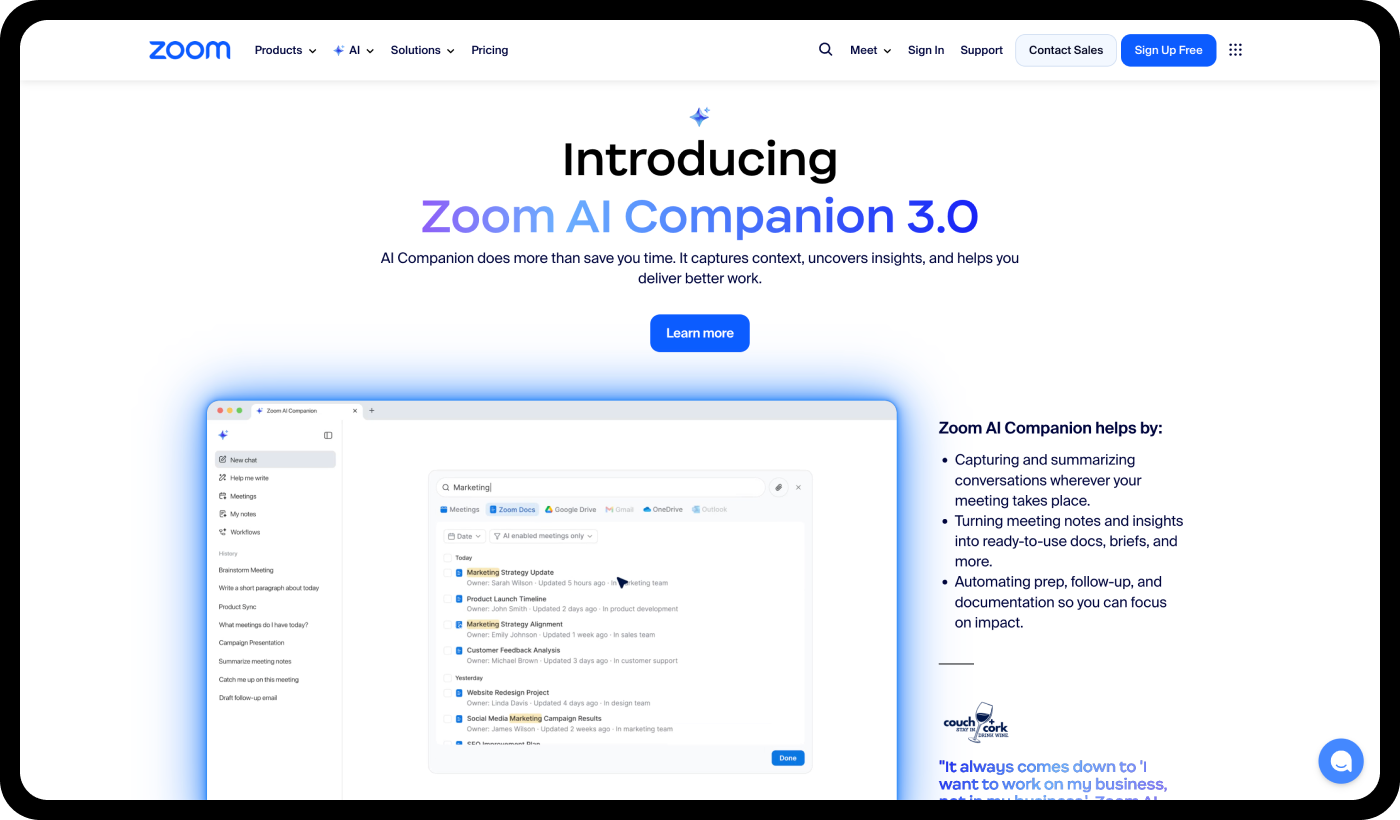 Zoom’s primary colour is blue, as seen in its logo and call-to-action (CTA) buttons throughout its website. Blue’s connection to trust and professionalism ties back to the security and reliability a user wants in a video communication platform. The use of white in its background and accents creates a sense of clarity, fostering ease of use within the platform.