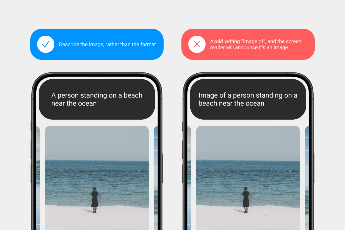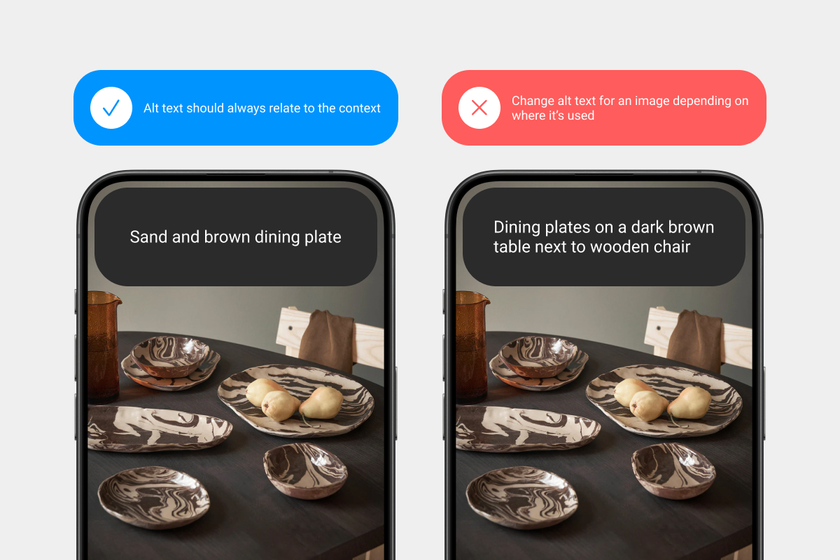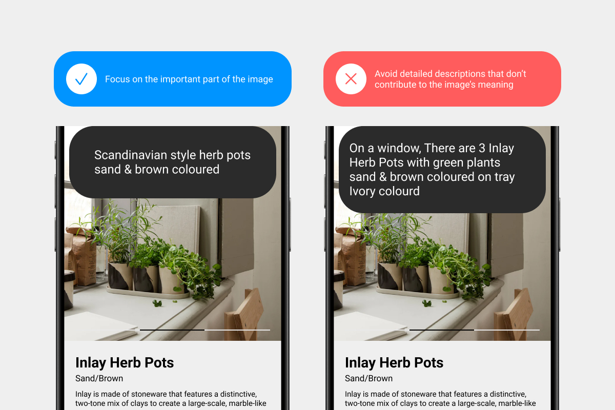 Describe the context and overall meaning, rather than focusing on the details. For example, in a shopping app, focus on the item for sale rather than the things around it.