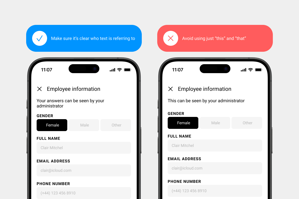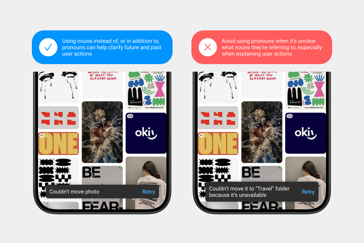 Using pronouns, like “it,” can get tricky when translators are working with small, unconnected strings of text and when nouns have genders in many languages. Repeat the noun, or clarify the noun in a message description.