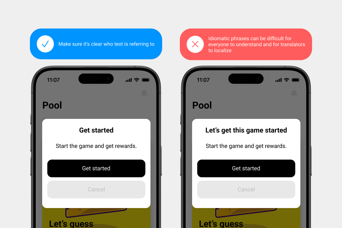Idiomatic or colloquial phrases can be confusing if the meaning isn’t clear. If you use them, clarify the purpose and context of the phrase to help the translator choose an appropriate alternative.