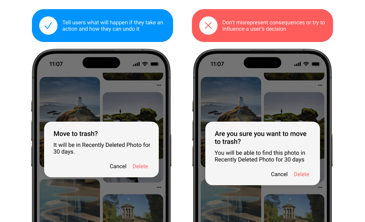 Emphasize the results of the user’s potential action in neutral, direct language. Avoid cautions or warnings that might sound alarming, intimidating, or condescending. Focus instead on communicating the consequences of a function.