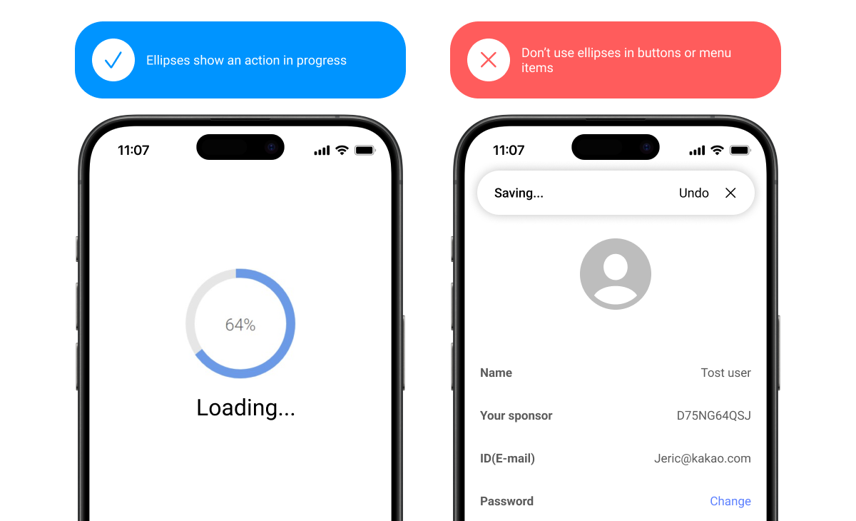 Don’t add a space before ellipses. Omit ellipses from menu items or buttons that open a dialog or start a process.