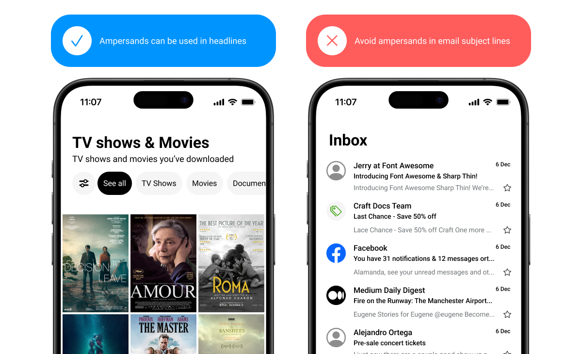 The “&” symbol can be used instead of “and” in headlines, column headers, table headers, navigation labels, and buttons. However, when there’s room, spelling out “and” can improve readability and make scanning easier.