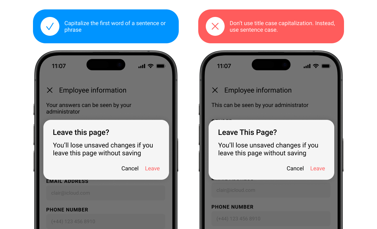 Unless otherwise specified, use sentence-style capitalization, where only the first letter of the first word in a sentence or phrase is capitalized. All text, including titles, headings, labels, menu items, and buttons should use sentence-style capitalization.