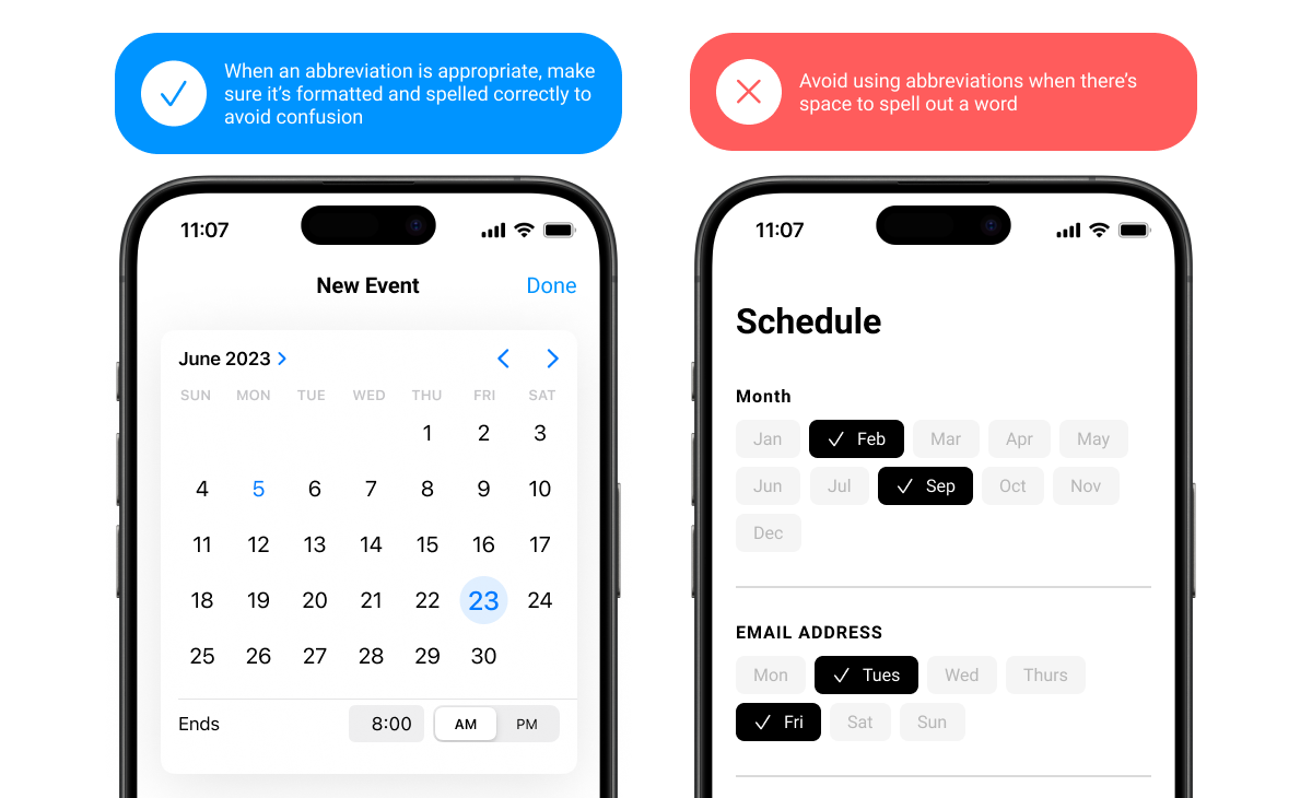 Spell out words whenever possible. Shortened forms of words can be difficult for people to understand and screen readers to read. Avoid Latin abbreviations in UI text such as e.g. or etc. Instead, use full phrases like "for example," or "and more."